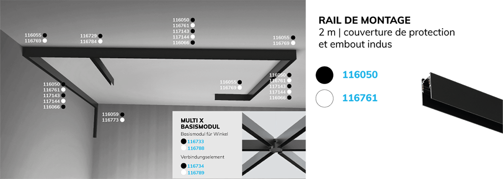 Rail en saillie, rail encastré ou rail suspendu, nous avons une solution adaptée à chaque domaine d'application. Nos différents types de rails couvrent tous les besoins. Choisissez librement votre type de montage en fonction de vos besoins. Découvrez-le maintenant !