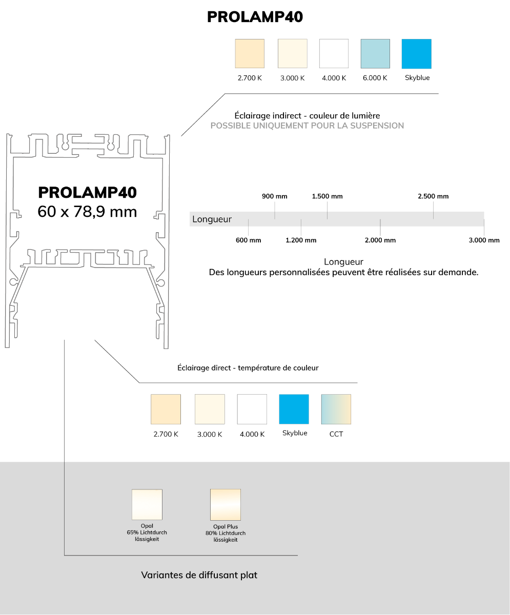 Pour votre projet spécifique, nous vous proposons, sur demande, un choix individuel de couleurs pour le profilé linéaire du luminaire. Vos locaux auront ainsi une touche unique, adaptée avec précision à vos exigences architecturales.
