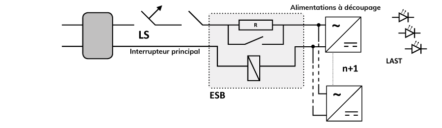 L’ESB est installé entre le fusible ou le disjoncteur et la charge. Il limite le courant d’appel pendant les ≈ 300 premières ms jusqu’à ce que les condensateurs des drivers LED soient chargés. Ensuite, un relais interne court-circuite l’ESB. Il est autoalimenté et inclut une surveillance de la température et une fonction de bypass.